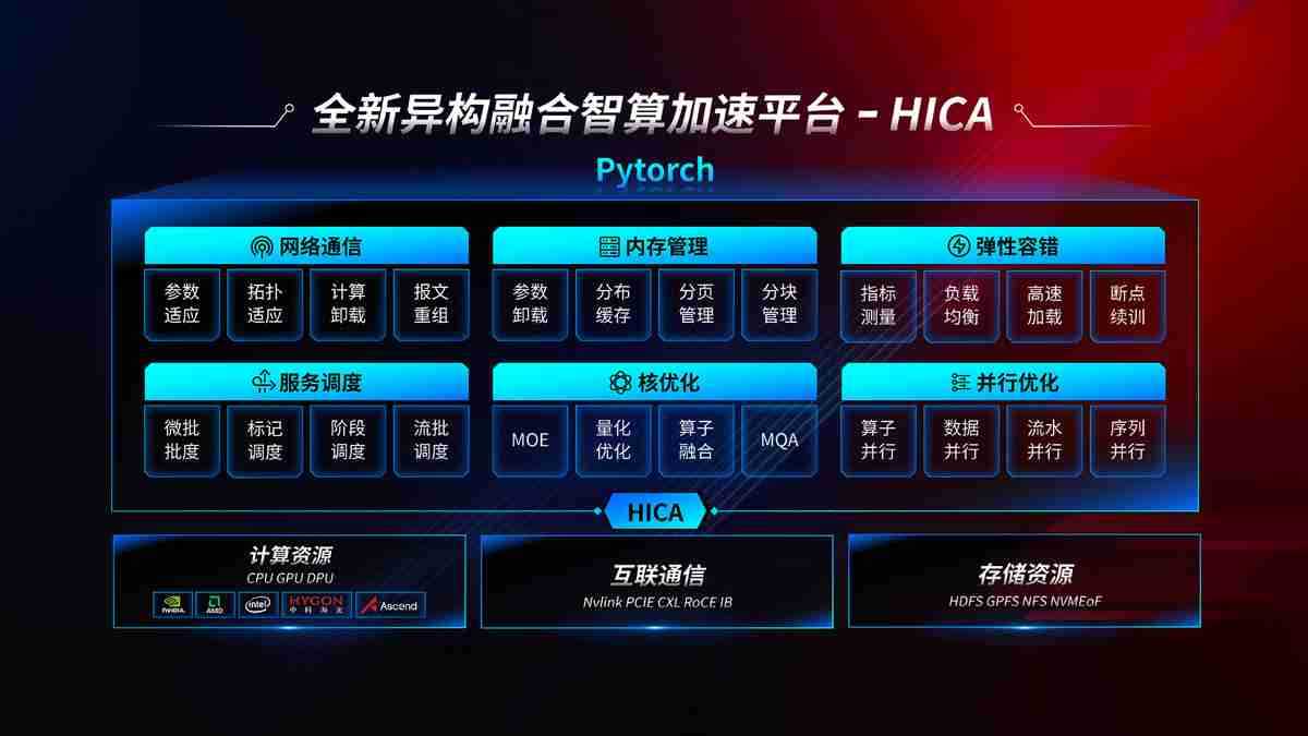 通过自研的服务层、、、、中间适配层、、、、以及调度编排算法,,采用数据并行、、、模型并行等多种并行方式,,,把并行计算任务进行有效的分解,,,,使其分别由相应的软件栈和算力资源来承接。。。。当GPU资源变化,,,,HICA可以实时动态调度计算子任务并调整模型拓扑和架构,,,以充分聚合各种算力资源。。