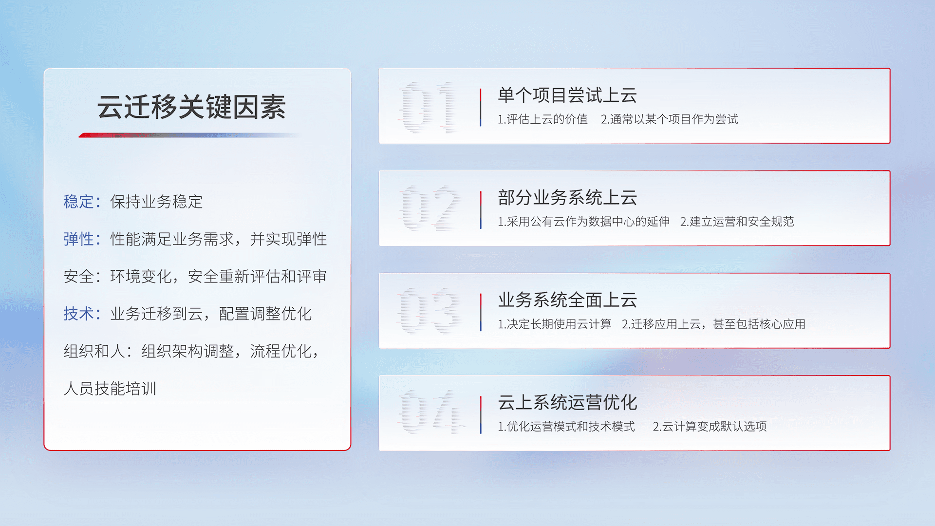 结合实际业务,,从规划设计、、、云平台选型、、、云原生改造、、数据迁移、、、集成交付,,,,迁移全过程为客户识别最佳上云路径,,,,做好风险识别管理,,,设计网络架构、、、、身份权限、、、、安全审计合规、、操作审计、、、日志审计、、、监控告警策略、、多站点容灾设计等,,对云上基础设施进行整体规划,,,,提升IT治理水平,,,,以满足弹性、、、、高可用、、、高性能的需求。。